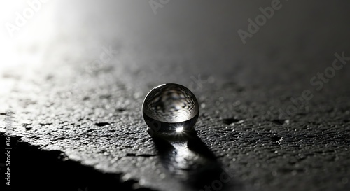 Macro shot of a single, perfect water droplet reflecting light on a textured dark surface.