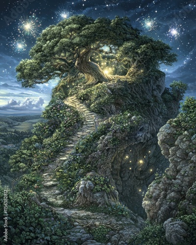 Magical Tree on Mountain Under Starry Sky with Glowing Lights