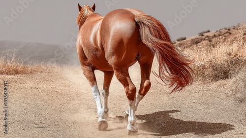 Majestic Brown Horse Running on Dusty Path Through Rural Landscape Under Warm Evening Light