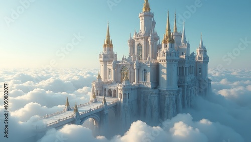 Majestic floating marble castle with golden spires and crystal bridges surrounded by clouds