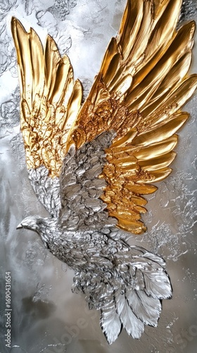 Majestic Golden and Silver Eagle Sculpture Soaring Against Textured Background