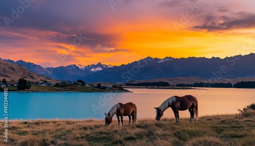 Majestic Horses Grazing at Sunset: Serene Mountain Lake Panorama