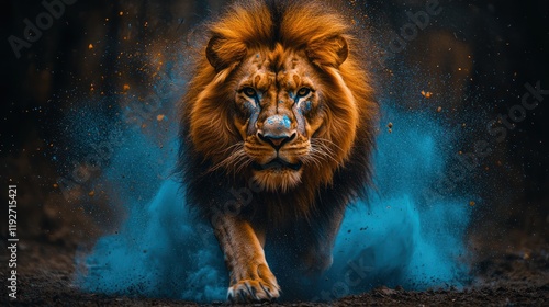Majestic lion surrounded by colorful dust.