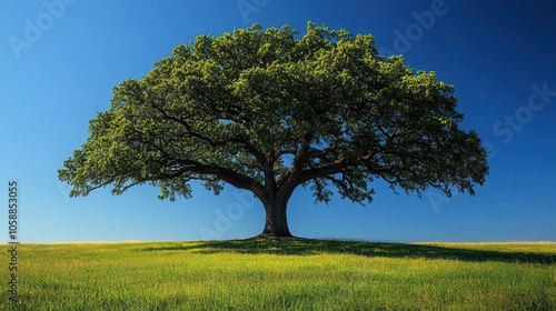 majestic live oak tree stands isolated against a clear blue sky, showcasing its sprawling branches and lush green leaves. the image reflects strength, resilience, and a deep connection to nature