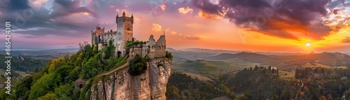 Majestic Medieval Castle Overlooking Rolling Hills and Forest at Sunset