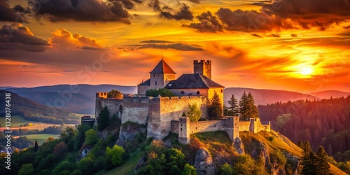 Majestic Silhouette: Sirok Castle, Hungary Panoramic View at Sunset