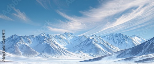 Majestic snow-covered mountain range under a vibrant blue sky with wispy clouds.