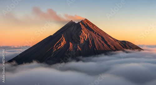 Majestic volcano erupting with smoke above clouds at sunrise, bathed in golden light.