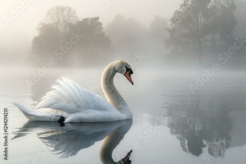 Majestic white swan gracefully swimming on a misty lake at dawn, creating a serene and peaceful atmosphere