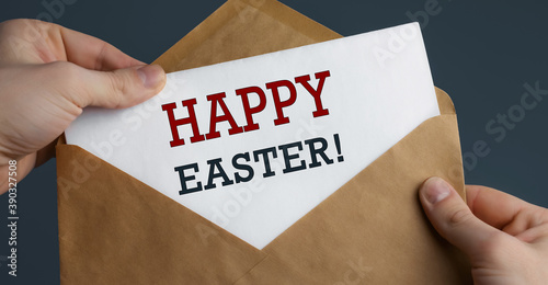 Male hands holding craft envelope with text HAPPY EASTER on blue background