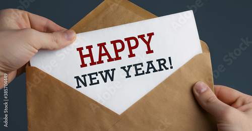 Male hands holding craft envelope with text HAPPY NEW YEAR on blue background