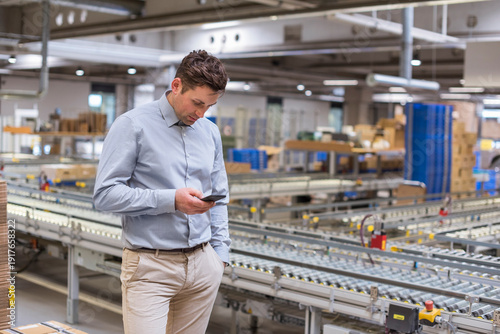 Man at conveyor belt in factory looking at cell phone
