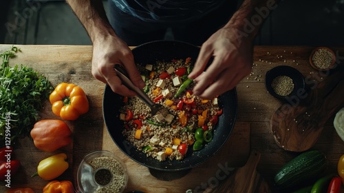 Man cooking a plant-based meal with quinoa, tofu, and fresh vegetables in a pan on a wooden kitchen counter