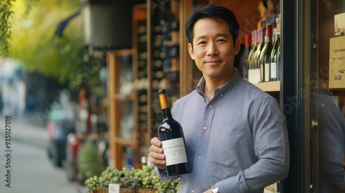 Man holding bottle of wine in front of a wine shop. Outdoor scene with wine bottles and greenery. Selective focus on the man.