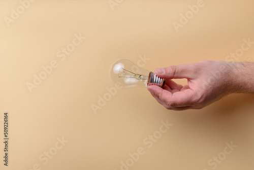Man holding glass light bulb on beige background with copy space.