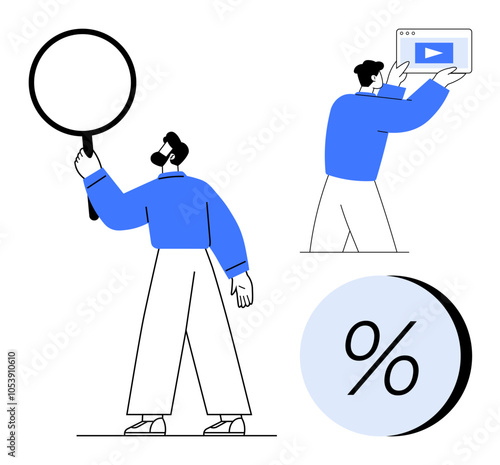 Man holding magnifying glass, person presenting tablet screen with play button, percentage symbol. Ideal for business presentations, marketing analytics, data analysis, educational material, online