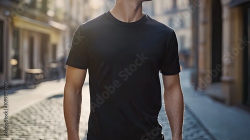 Man in Black T-Shirt Walking on City Street - Minimalist Fashion Photography