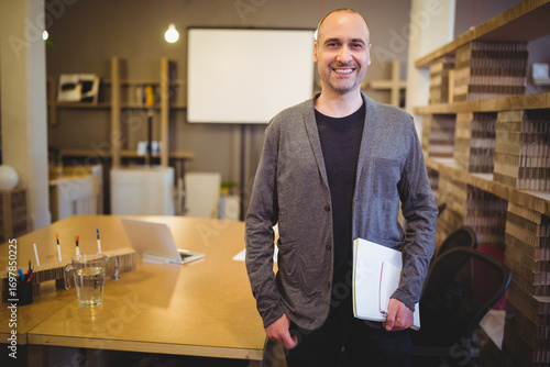 Man standing and smiling in modern office meeting area holding papers and notebook near laptop