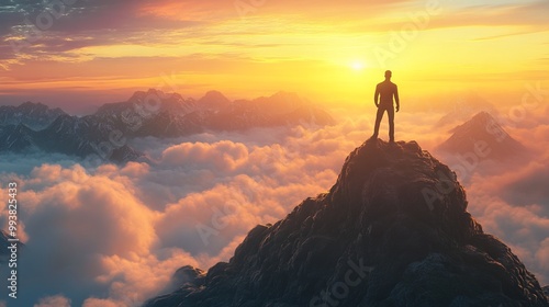 Man Standing on Mountain Top at Sunrise, Feeling Success. AI generated illustration