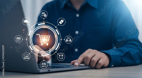 Man using laptop with digital shopping cart interface and e-commerce icons showing online business growth and customer engagement