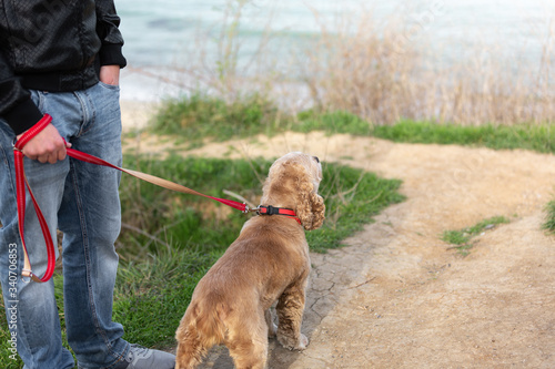Man walking with a dog at the sea shore. Dog handler is walking with an obedient dog on a sea coast