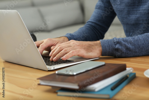 Man with laptop learning at wooden table indoors, closeup