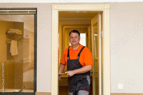 Man work clothes repairing the lock on the door.