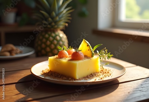 Mango cheesecake top view on plate