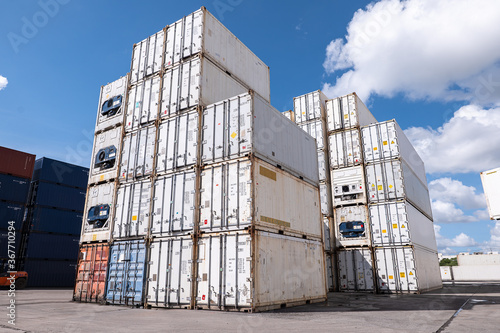 Many containers in warehouse for business logistics background, Transportation is import and export cargo storage ready to shipping global, business shipping concept in a day and blue sky background.