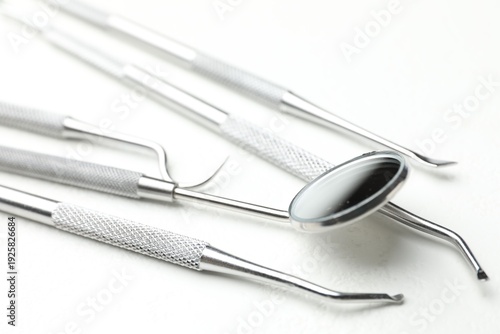 Many different dental tools on white table, closeup