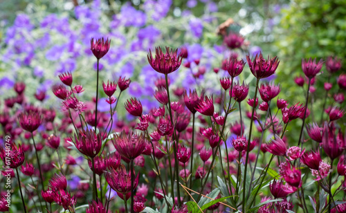 Maroon colour star-shaped astrantia masterwort flowers in foreground, with purple blue geraniums behind. Astrantia is a low maintenance, wildlife friendly perennial and is a good ground cover plant.