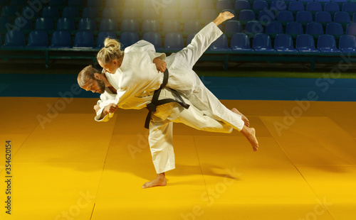 mattress, practice, woman, caucasian, defending, exercise, training, competition, combat, 2, fighter, throwing, kimono, uniform, holding, karate, skill, duel, action, man, fight, motion, belt, athlete, judo, active, girl, aikido, instructor, healthy, indoor, sport, male, strong, martial art, strenght, laugh, agression, throw, black belt, capture