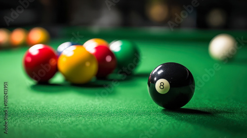 Masterful arrangement of billiard balls on a vibrant green table under bright lights