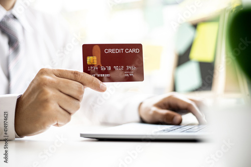 Men hold red credit cards to pay for items purchased through online shopping sites, online shopping is an option that does not leave home, but can shop. Credit card concept.