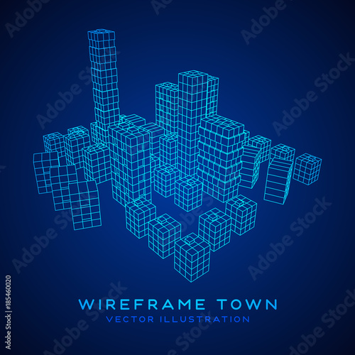 Mesh low poly wireframe cubes array like skyscraper city. Connected lines town. Connection Box Structure. Digital Data Visualization Concept. Vector Illustration.