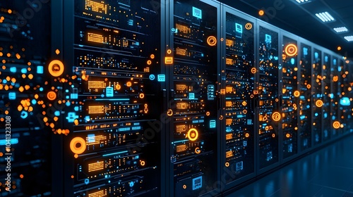 Mesh Outline of Futuristic Digital Data Center with Glowing Server Racks and Illuminated Pathways Conceptual Visualization of Modern IT Infrastructure Cloud Computing