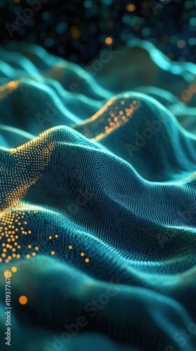 Mesmerizing glowing waves and shimmering particles in a futuristic digital landscape Abstract dynamic and colorful 3D rendering with fluid motion gradient patterns and luminous effects