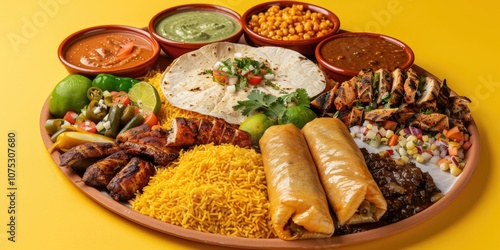 Mexican food on a plate. Includes tacos, rice, beans and cheese. Vegetarian option.