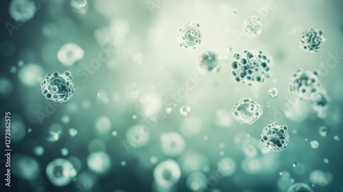 Microscopic View of Floating Virus Cells in Abstract Green and Blue Background