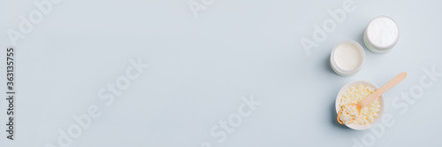 Milk mushroom organic probiotic fermented milk products glass bowl. Fermented foods healthy eating concept. Copy space.