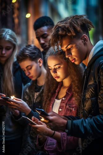 Millennial generation teenagers friends playing in smartphones outdoor. Social media addiction on modern community. Vertical