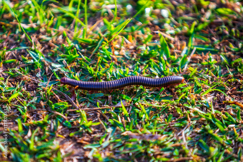 millipede on the ground of grass.