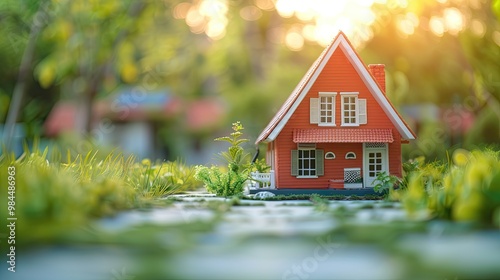 Miniature Model of a Classic Blue and White House with Red Accents in a Sunny Garden Setting