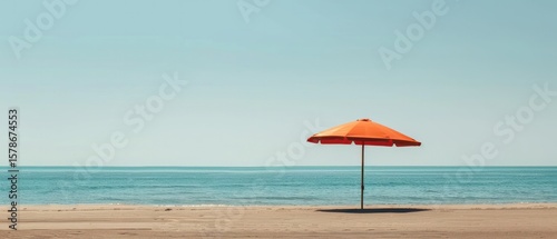 Minimalism lone beach umbrella on a deserted beach with a calm sea and clear sky.