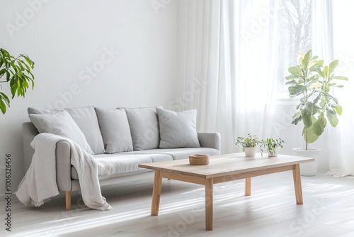 Minimalist, A photo of a mid-century modern interior in a modern living room with a fluffy sofa and table and a view of the pot. Generative AI