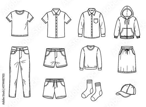 Minimalist Black & White Doodle Shirt and Apparel Icons: Clean Vector Art