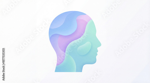 Minimalist human profile with colorful pastel fluid layers. Concept of mental health awareness, neurodiversity, emotional intelligence, and abstract cognitive psychology in a clean 3D style.