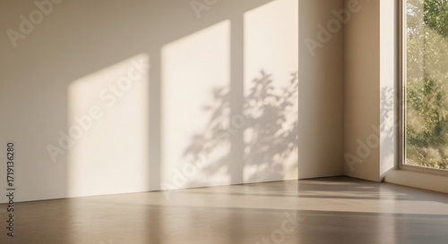 Minimalist interior with warm sunlight and long window shadows