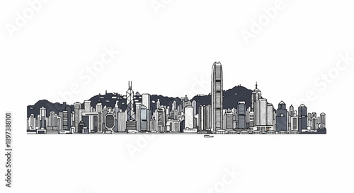 Minimalist line art cityscape panorama with tall buildings, mountains, and a subtle waterfront on white background