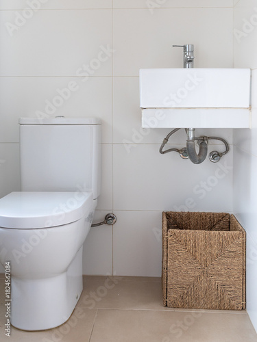 Minimalist white toilet and wall-mounted sink with exposed plumbing, placed in a clean tiled bathroom with a wicker trash bin.
